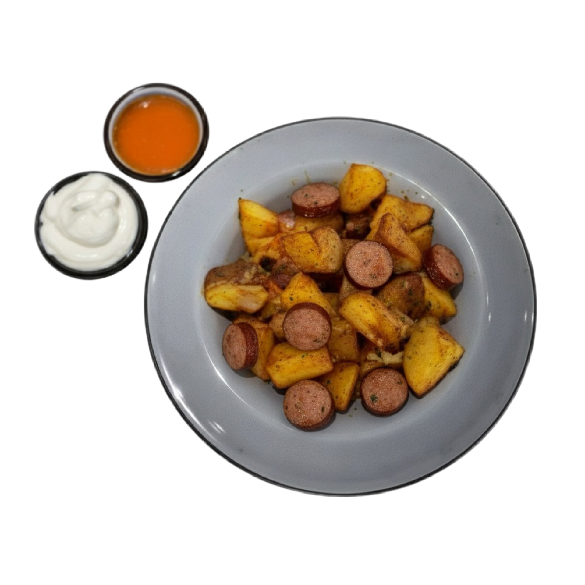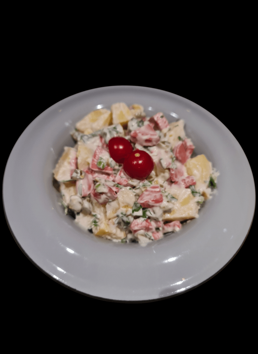 سیب زمینی+ سوسیس+ خیارشور + پیازچه + شوید + سس مایونز