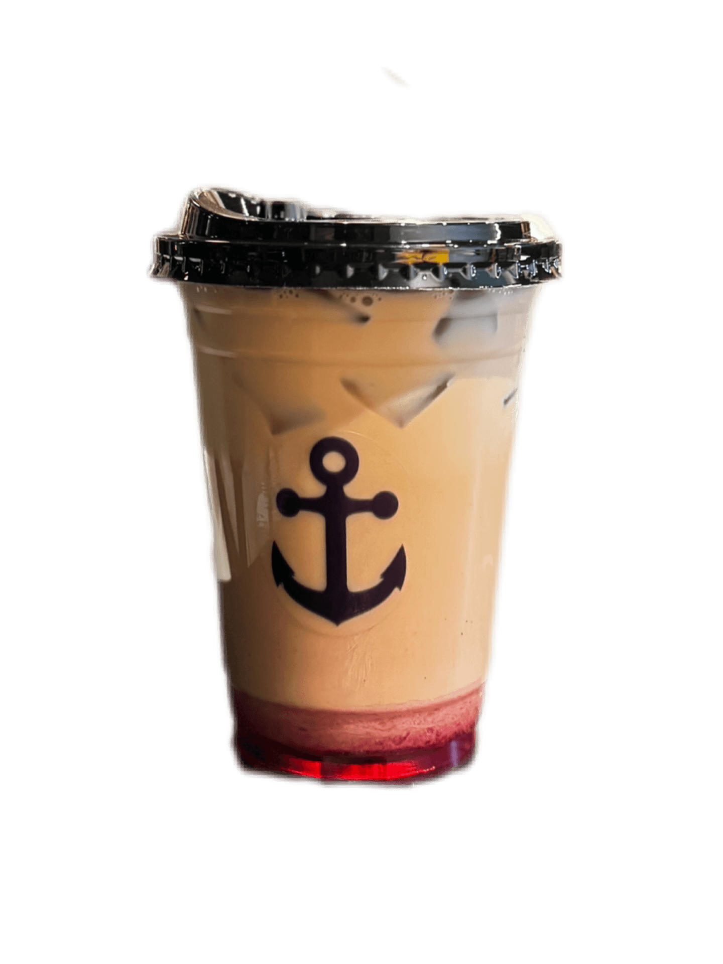 شات قهوه + شیر سرد (یخ) + سیروپ توت فرنگی
