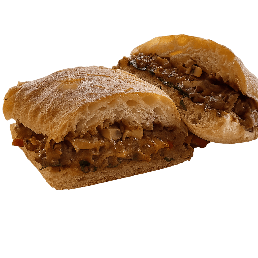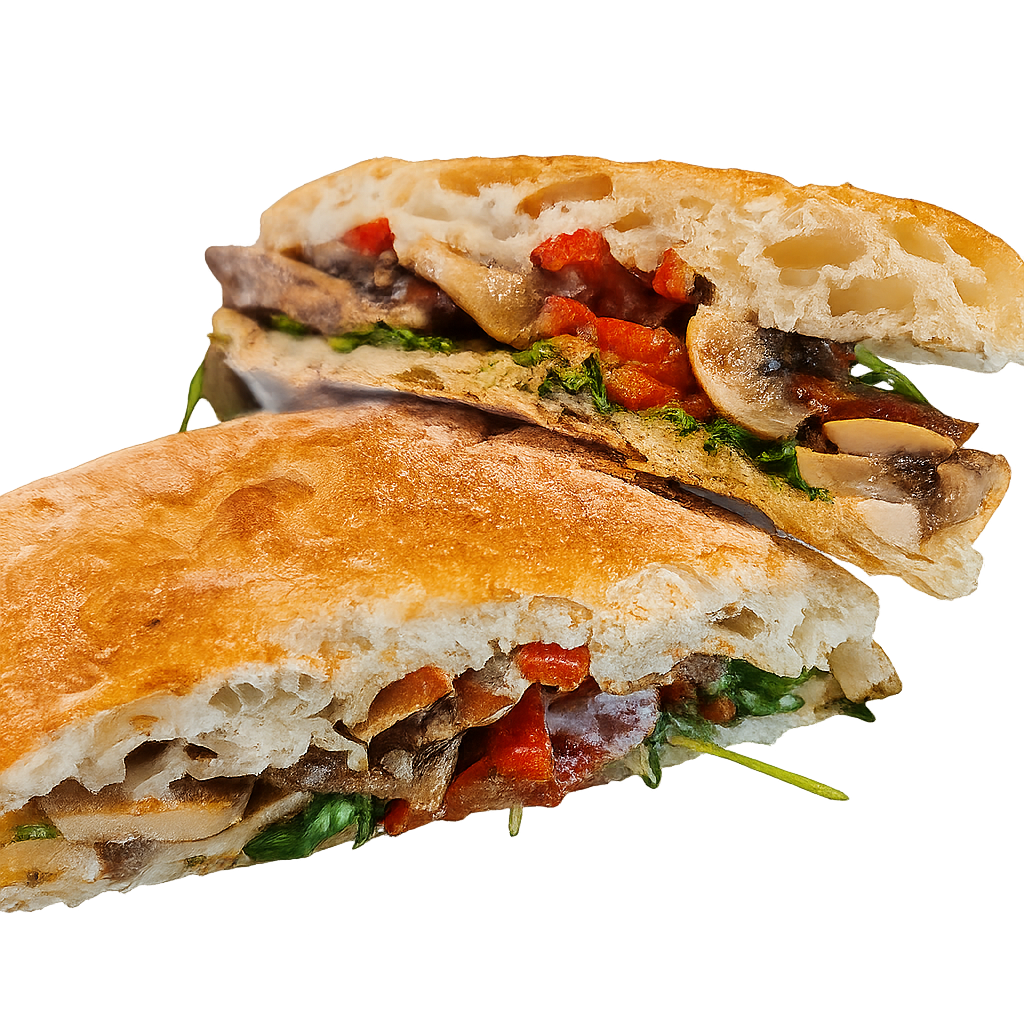 نان چاپاتا + 200 گرم گوشت چرخ کرده گوساله + قارچ + فلفل دلمه ایی + روکولا + پنیر پیتزا +هالوپینو